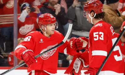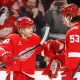 Jan 29, 2026; Detroit, Michigan, USA; Detroit Red Wings right wing Patrick Kane (88) receives congratulations from teammates after he gets his 1375 point in the...