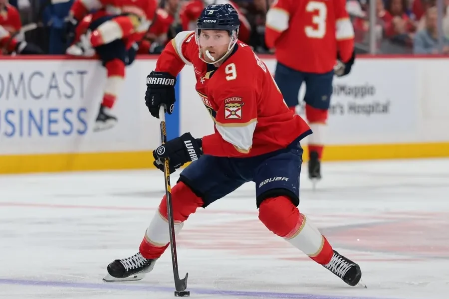 Apr 2, 2026; Sunrise, Florida, USA; Florida Panthers center Sam Bennett (9) moves the puck against the Boston Bruins during the first period at Amerant Bank...