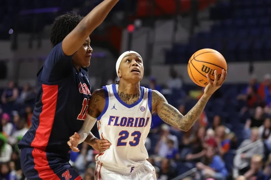 Florida guard Liv McGill (23) shoots past Mississippi forward Christeen Iwuala (12) during the first half of an NCAA women’s basketball game at Steven C. O’Connell...