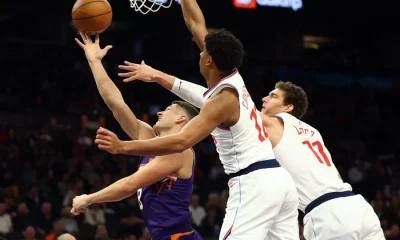 Feb 1, 2026; Phoenix, Arizona, USA; Phoenix Suns guard Grayson Allen (8) drives to the basket against Los Angeles Clippers guard Cam Christie (12) and center...