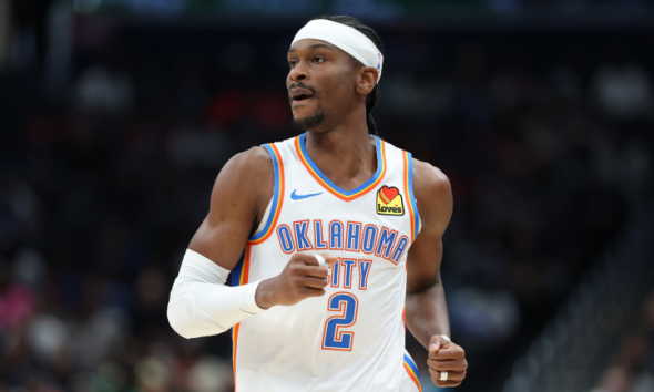 Mar 30, 2026; Oklahoma City, Oklahoma, USA; Oklahoma City Thunder guard Shai Gilgeous-Alexander (2) drives against Detroit Pistons forward Ronald Holland II (5) during the second...