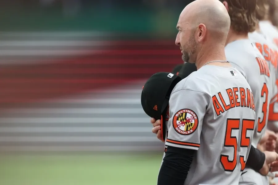 Apr 3, 2026; Pittsburgh, Pennsylvania, USA; Baltimore Orioles manager Craig Albernaz (55) during the national anthem against the Pittsburgh Pirates at PNC Park. Mandatory Credit: Charles...