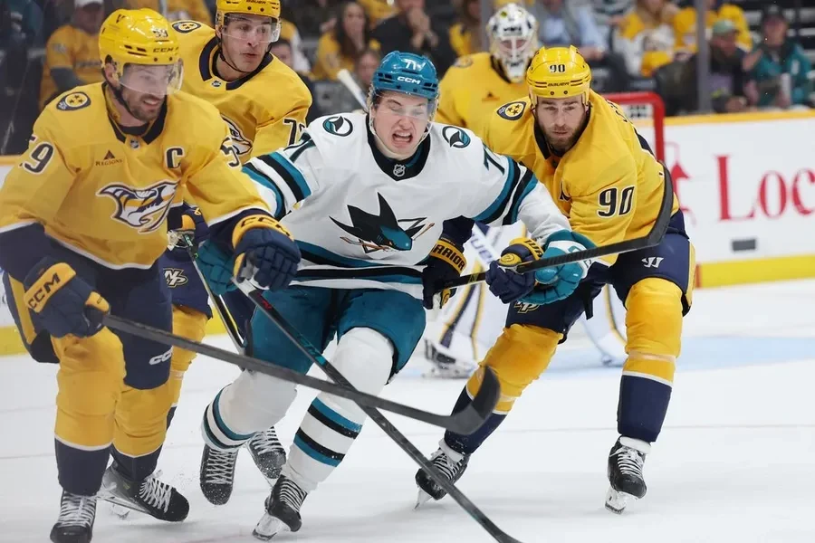 Apr 13, 2026; Nashville, Tennessee, USA; San Jose Sharks center Macklin Celebrini (71) competes for the puck against Nashville Predators defenseman Roman Josi (59) and center...