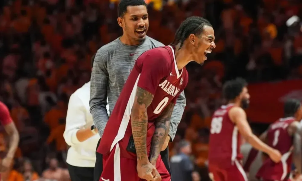Alabama guard Labaron Philon Jr. (0) celebrates winning a NCAA basketball game between Tennessee and Alabama at Thompson-Boling Arena at Food City Center in Knoxville, Tenn.,...