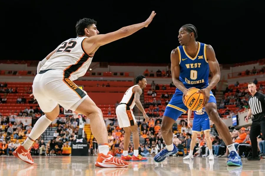 Feb 24, 2026; Stillwater, Oklahoma, USA; West Virginia Mountaineers forward Brenen Lorient (0) drives around Oklahoma State Cowboys forward Parsa Fallah (22) during the second half...