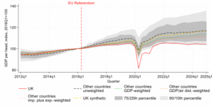 Figure 1 shows UK GDP per head from 2012 to 2025 compared to these five comparator aggregates. Before the referendum, UK GDP per capita grew at broadly the same pace as in the comparison group. After 2016, the lines diverge. By the year to 2025 Q1, UK GDP per head had grown 6–10 percentage points less than in comparable economies, and only about 4% in absolute terms over the whole period. Our central estimate – the average across the five weighting schemes – is that Brexit reduced UK GDP per head by around 8%.