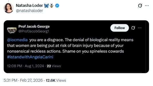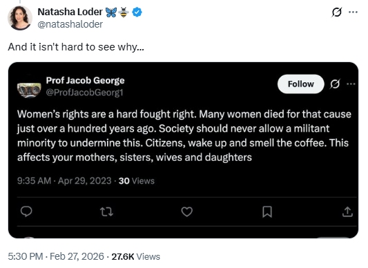 Wings readers might be scratching their heads trying to detect anything improper there. Professor George said women’s rights were worth defending and expressed the view that men shouldn’t punch women in the head in boxing matches – opinions which until recently would have been reliably shared by all human beings outside of the Taliban. He also endorsed a tweet from JK Rowling (which you can read in full here) in support of Sandie Peggie, who an employment tribunal found had been harassed by her employer in the service of a trans doctor.