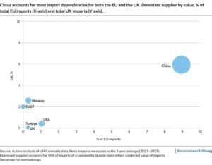 Trade data underlines the rationale for deeper cooperation. Our recent empirical analysis points to a striking overlap in shared vulnerabilities. Both sides are highly exposed to potential supply shocks: nearly a fifth of EU imports and around 15 % of UK imports by value come from ‘dominant suppliers’ – trading partners that account for at least 50% of imports for specific products. In most cases, that supplier is China (figure 3).
