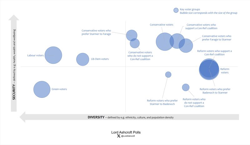 For a Conservative-Reform alliance to equal the sum of its parts, or come close to doing so, it would have to retain current Tories at the top and centre of the map who are closer to the Labour and Lib Dem voter bases than they are to Reform’s. At the same time, it would have to hold on to current Reform supporters around the “3 o’clock” position. In other words, it would have to bring together voters who have almost diametrically opposed views on many economic and social issues.