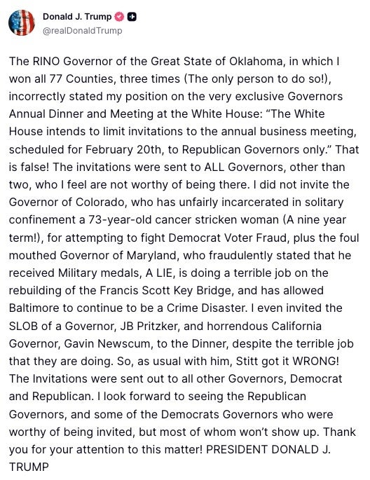 In another post, the president attacked Stitt and several of the Democratic governors: