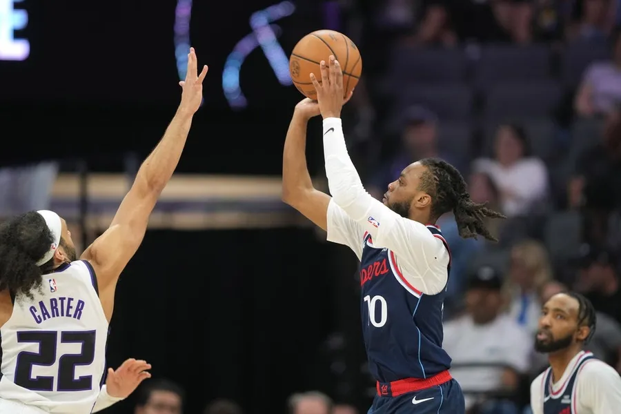 Apr 5, 2026; Sacramento, California, USA; LA Clippers guard Darius Garland (center right) shoots against Sacramento Kings guard Devin Carter (22) during the second quarter at Golden 1 Center. Mandatory Credit: Darren Yamashita-Imagn Images Kawhi Leonard scored 26 points and John Collins added 25 as the Los Angeles Clippers moved into eighth place in the Western Conference standings with a 138-109 road victory over the Sacramento Kings on Sunday.