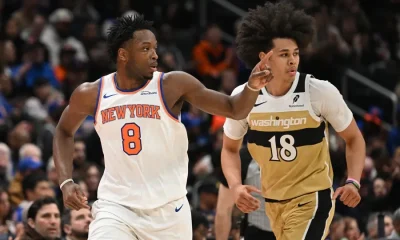 NBA: New York Knicks at Washington WizardsFeb 3, 2026; Washington, District of Columbia, USA; New York Knicks forward OG Anunoby (8) reacts after making a three point basket in front of Washington Wizards forward Kyshawn George (18) during the first quarter at Capital One Arena. Mandatory Credit: Rafael Suanes-Imagn Images