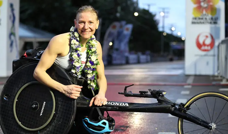 Newly crowned World Marathon Majors series champion Susannah Scaroni won the women’s wheelchair division in a course record 1:48:37. It was her first time ever in Hawaii.