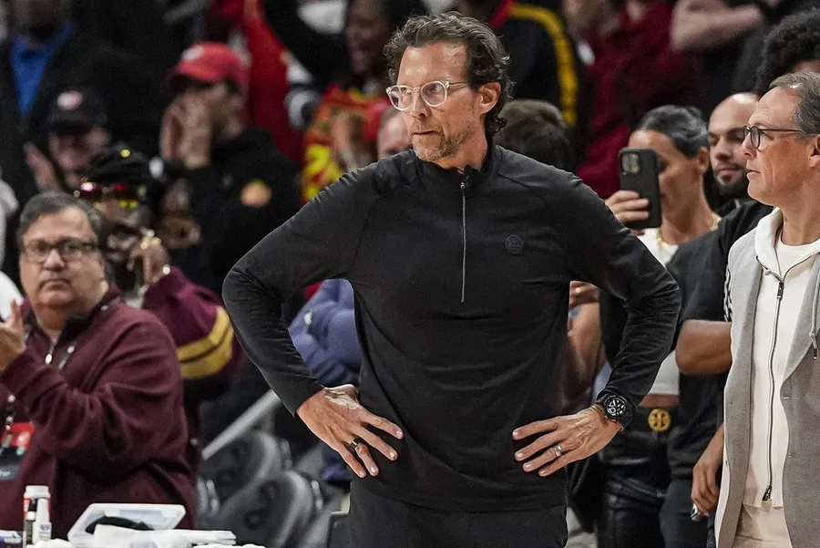 Apr 10, 2026; Atlanta, Georgia, USA; Atlanta Hawks head coach Quin Snyder reacts on the sideline during the game against the Cleveland Cavaliers during the second half at State Farm Arena. Mandatory Credit: Dale Zanine-Imagn Images CJ McCollum scored 25 of his game-high 29 points in the first half and Dyson Daniels collected 13 points, 10 rebounds and 12 assists as the Atlanta Hawks clinched a playoff spot with a 124-102 rout of the visiting Cleveland Cavaliers on Friday night.
