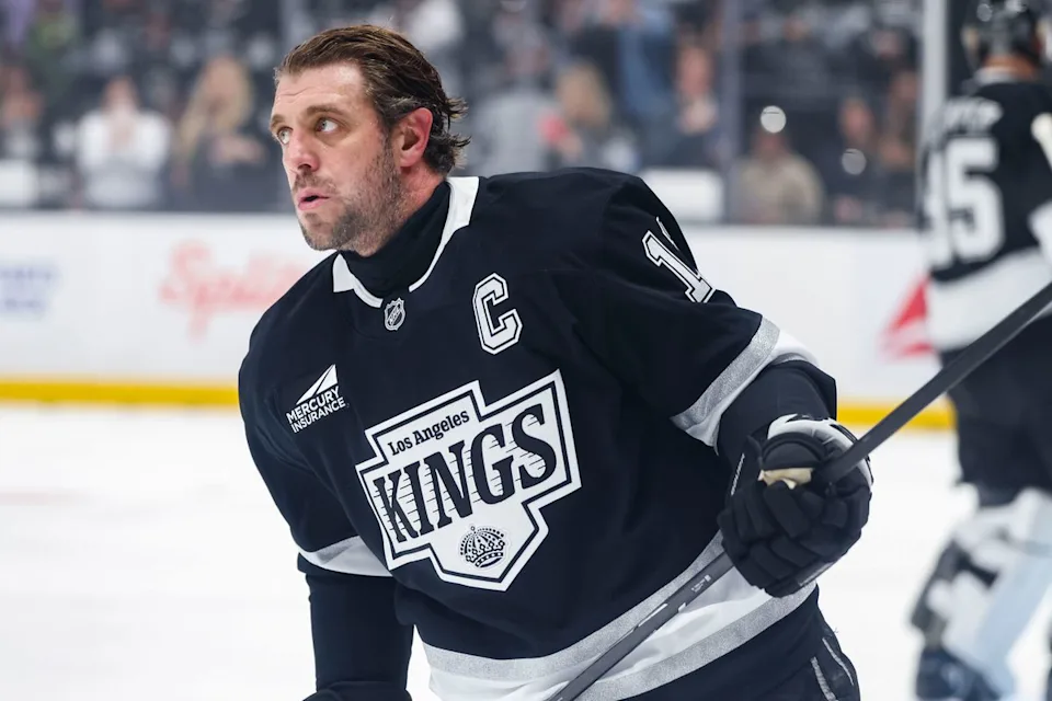 Anze Kopitar #11 of the Los Angeles Kings on the ice during warm ups before an NHL hockey game against the Nashville Predators, Thursday April 2, 2026 in Los Angeles, Calif.