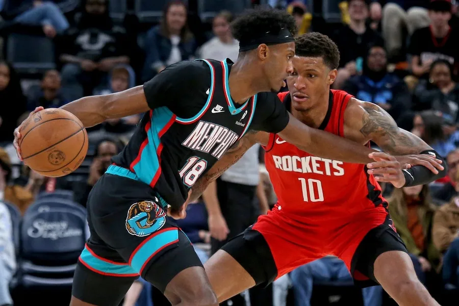 NBA: Houston Rockets at Memphis GrizzliesMar 27, 2026; Memphis, Tennessee, USA; Memphis Grizzlies forward Olivier-Maxence Prosper (18) dribbles against Houston Rockets forward Jabari Smith Jr. (10) during the third quarter at FedExForum. Mandatory Credit: Petre Thomas-Imagn Images