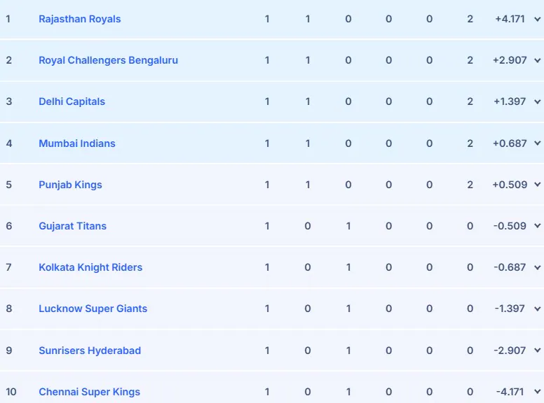 Updated IPL 2026 Points Table: