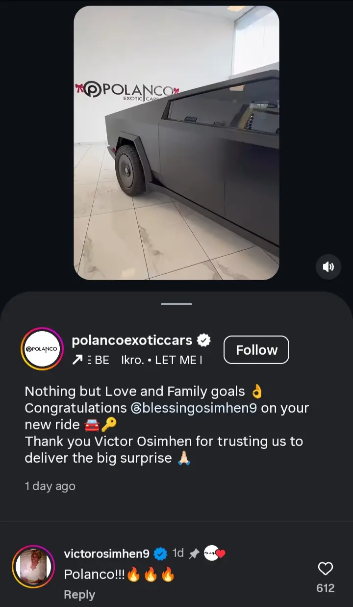 Victor Osimhen has surprised his sister Blessing with a customised Tesla Cybertruck reportedly valued at about ₦400 million.