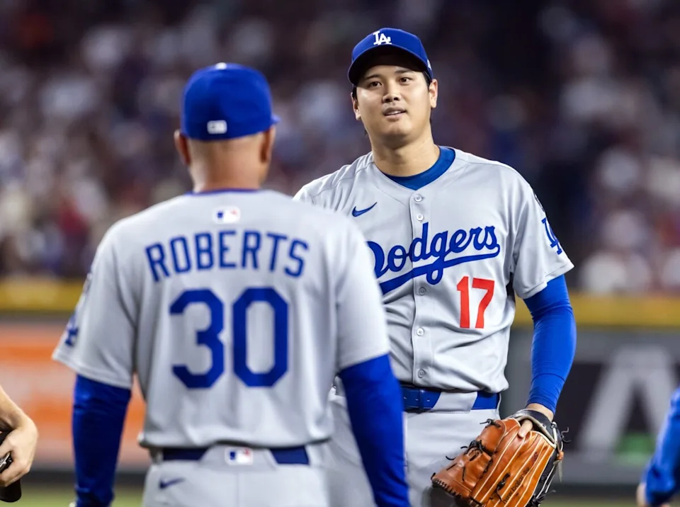 Sep 23, 2025; Phoenix, Arizona, USA; Los Angeles Dodgers pitcher/designated hitter Shohei Ohtani looks at manager Dave Roberts as he walks to the pitchers mound against the Arizona Diamondbacks at Chase Field.