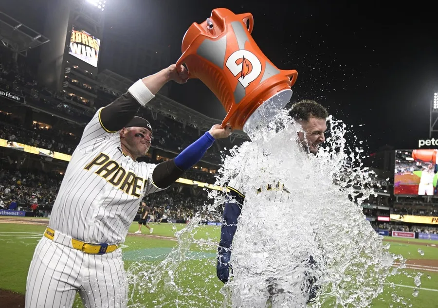 Apr 15, 2026; San Diego, California, USA; San Diego Padres first baseman Ty France, left, dumps a cooler over center fielder Jackson Merrill after he hit a walk-off double during the ninth inning against the Seattle Mariners at Petco Park. All MLB players are wearing number 42 today to honor Jackie Robinson. Mandatory Credit: Denis Poroy-Imagn Images Jackson Merrill’s two-run double capped a five-run rally in the bottom of the ninth Wednesday night as the San Diego Padres stretched their winning streak to seven games with a wild 7-6 win over the visiting Seattle Mariners.
