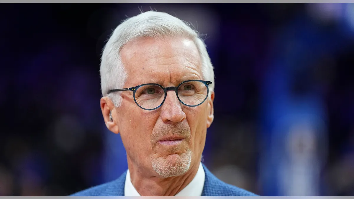 ESPN play-by-play commentator Mike Breen looking on court at Wells Fargo Center