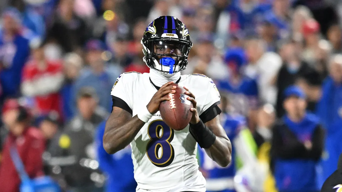 Baltimore Ravens quarterback Lamar Jackson (8) looks to pass during the first quarter against the Buffalo Bills at Highmark Stadium on Sept. 7, 2025.(Mark Konezny/Imagn Images)