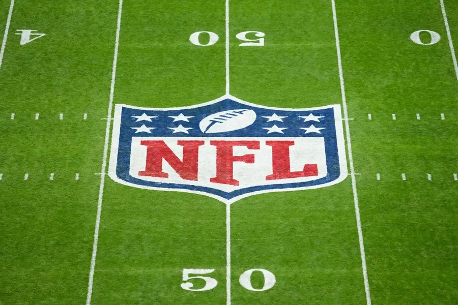 Nov 16, 2025; Madrid, Spain; The NFL logo at midfield is seen prior to the 2025 NFL Madrid Game between the Miami Dolphins and the Washington Commanders at Santiago Bernabeu Stadium. Mandatory Credit: Kirby Lee-Imagn Images