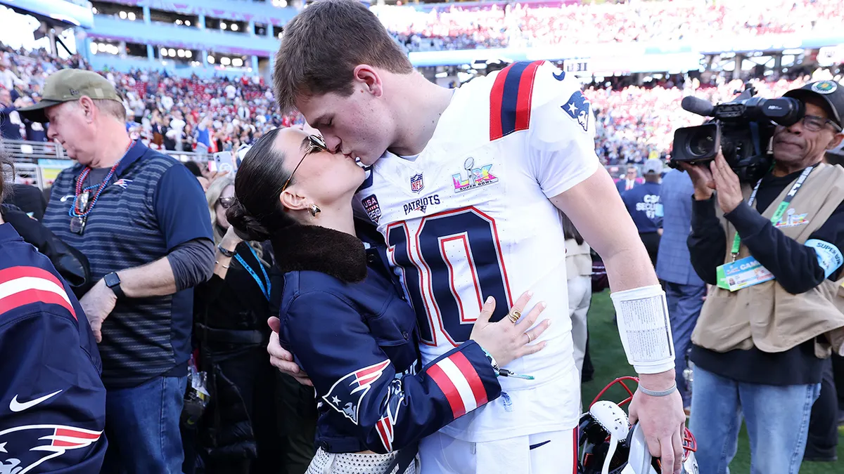 Drake Maye (10) of the New England Patriots kisses his wife Ann Michael Maye prior to the start of Super Bowl LX against the Seattle Seahawks at Levi’s Stadium in Santa Clara, California, on Feb. 8, 2026. (Kevin C. Cox/Getty Images)