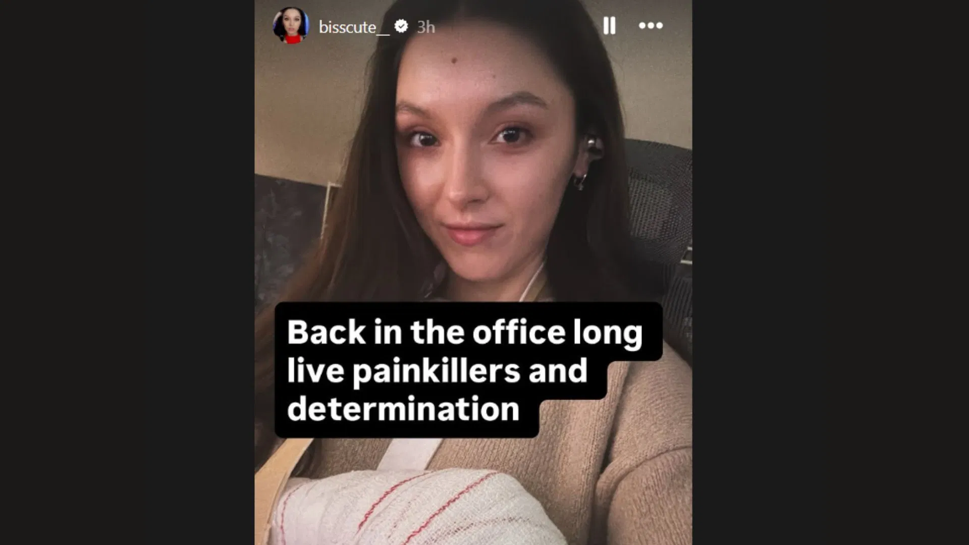 “Back in the office. Long live painkillers and determination.”