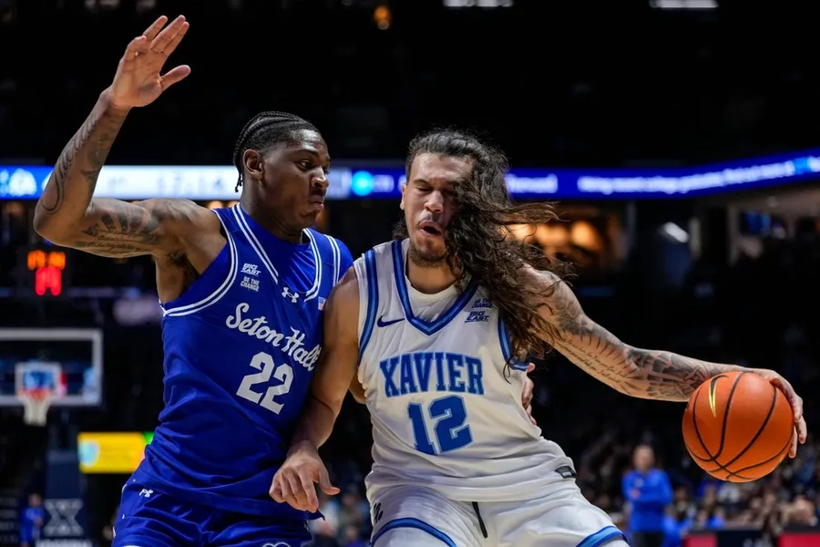 Xavier Musketeers forward Tre Carroll (12) drives against Seton Hall Pirates guard Elijah Fisher (22) in the first half of the NCAA Big East conference basketball game between the Xavier Musketeers and the Seton Hall Pirates at the Cintas Center in Cincinnati on Tuesday, March 3, 2026. Xavier trailed 33-32 at halftime. NEW YORK — In his first season coaching in the Big East, Richard Pitino often praised the scoring prowess of Tre Carroll and lamented Xavier’s shaky defense.