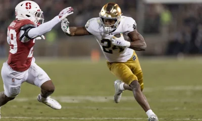Nov 29, 2025; Stanford, California, USA; Notre Dame Fighting Irish running back Jadarian Price (24) runs with the football against Stanford Cardinal safety Darrius Davis (29) during the first quarter at Stanford Stadium. Mandatory Credit: Stan Szeto-Imagn Images
