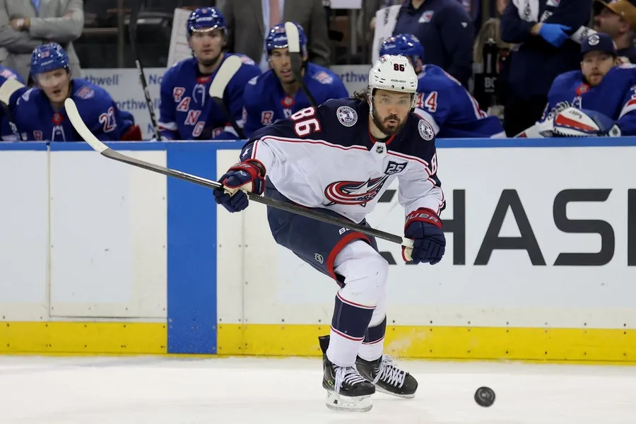 Mar 2, 2026; New York, New York, USA; Columbus Blue Jackets right wing Kirill Marchenko (86) plays the puck against the New York Rangers during the third period at Madison Square Garden. Mandatory Credit: Brad Penner-Imagn Images
