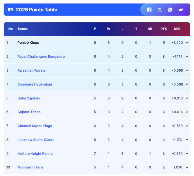A total of two matches took place on Sunday, but the IPL 2026 points table saw only two teams swapping their positions. In the day game, Kolkata Knight Riders registered a comeback win by four wickets against Rajasthan Royals at Eden Gardens. With the win, the three-time champions rose to the ninth spot, with Mumbai Indians slipping to the bottom position in the points table. In the night game, Punjab Kings outplayed Lucknow Super Giants by a massive margin of 54 runs to retain their top position. Despite the loss, LSG remained in the eighth spot.