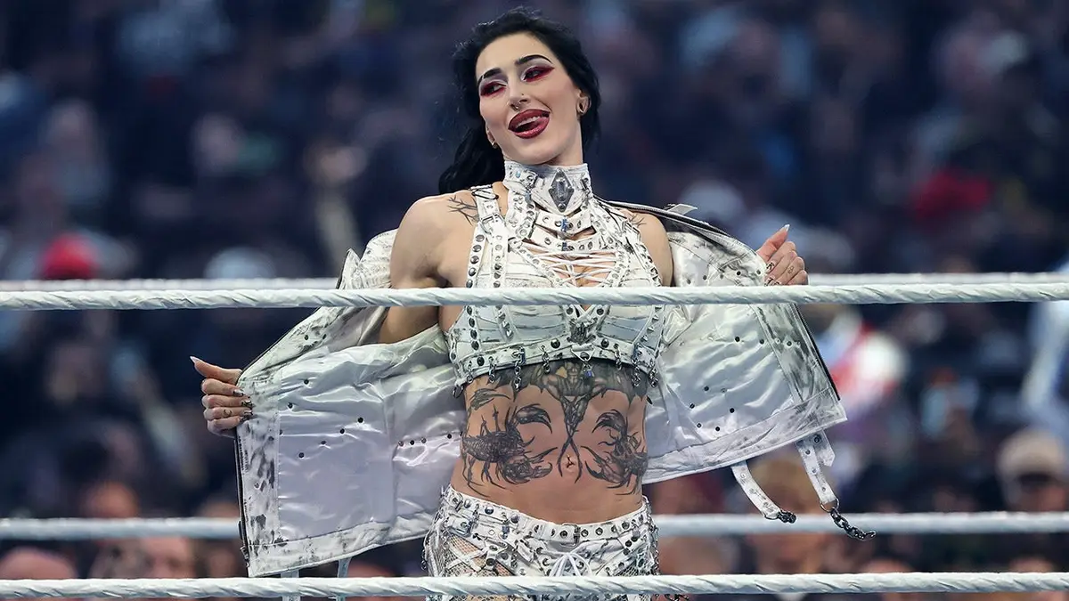 Rhea Ripley is introduced before the WWE Women’s Championship match against Jade Cargill during WrestleMania 42 at Allegiant Stadium in Las Vegas, Nev., on April 19, 2026. (Ethan Miller/Getty Images)