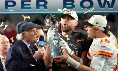 Super Bowl 57: Kansas City Chiefs quarterback Patrick Mahomes passes the the Lombardi Trophy to Travis Kelce after winning the Super Bowl against the Philadelphia Eagles at State Farm Stadium on Feb 12, 2023. Travis Kelce and the Kansas City Chiefs plan to discuss the star tight end’s playing future following Super Bowl LX, NFL Network reported on Sunday.