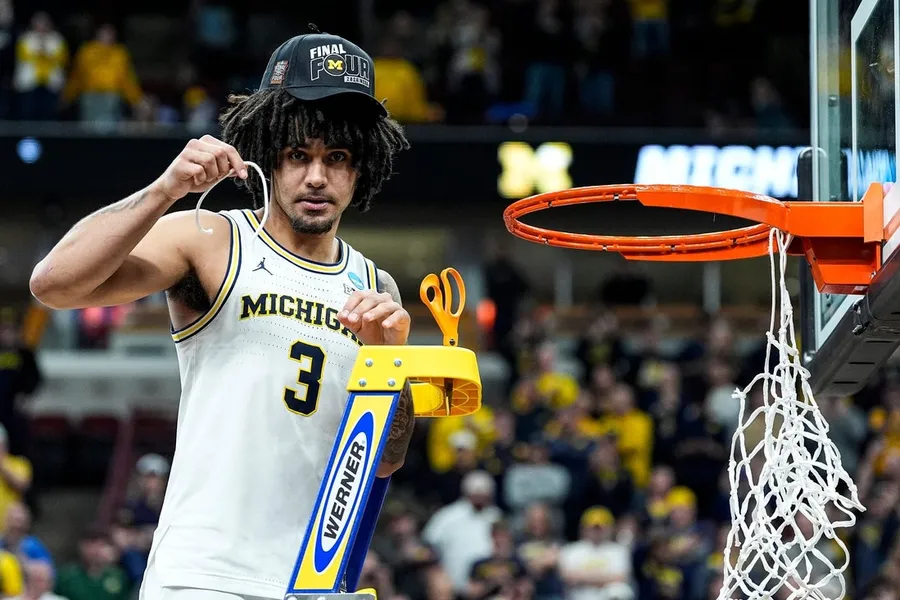 Michigan guard Elliot Cadeau (3) cuts down net to celebrate 95-62 win over Tennessee at the NCAA Tournament Midwest Regional Final at United Center in Chicago on Sunday, March 29, 2026.