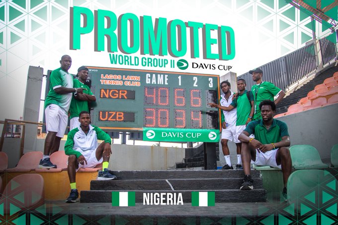 Nigeria Davis Cup Team has earned promotion to Davis Cup World Group II after defeating Uzbekistan Davis Cup Team 3–1 in their playoff tie.