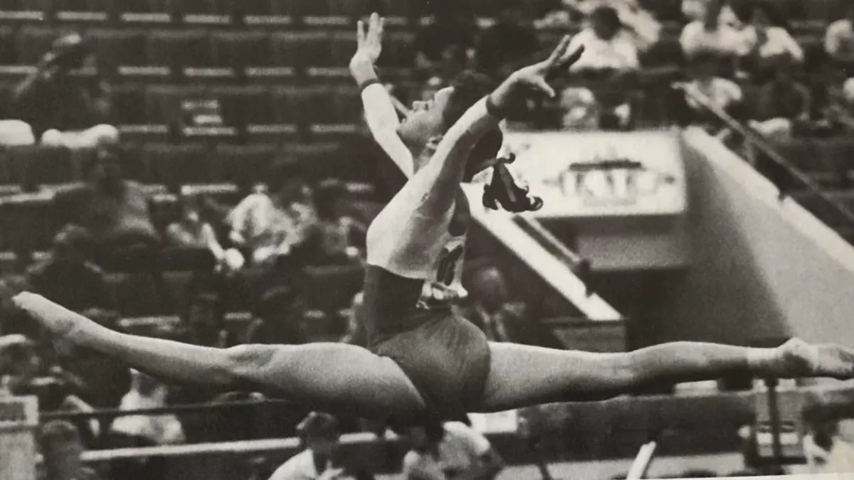 Jennifer Sey, the 1986 U.S. national all-around gymnastics champion, performs a split leap during competition.(XX-XY Athletics/Jennifer Sey)