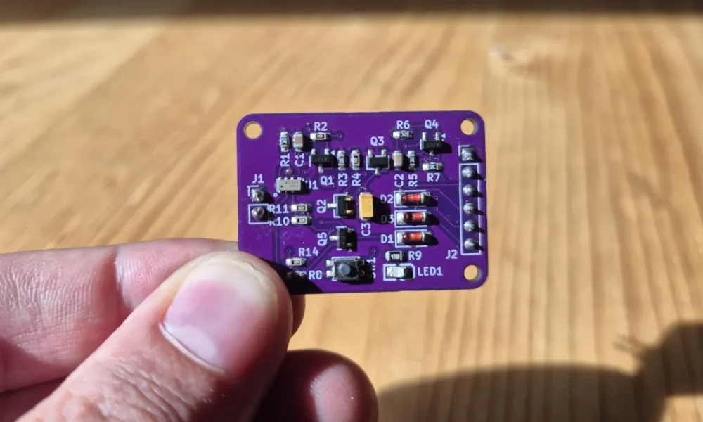 The small PCB, called the powerTimer, essentially acts as a middleman for power delivery to another microcontroller. On the PCB is an RV3028-C7 real-time clock, which uses a mere 45 nA of current and can interact with the second microcontroller through a timer or alarm. When commanded, the powerTimer uses an SR latch as its main control circuit, allowing single button presses to change the power state for the second microcontroller. Once the powerTimer powers up the second microcontroller, that microcontroller can communicate back to the powerTimer with a “DONE” signal, and once this signal is received, the powerTimer will cut power and wait for the next interrupt to occur.