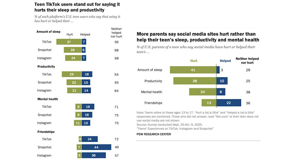 Perhaps unsurprisingly, when researchers surveyed those same teens’ parents, they had a more negative view of the apps’ impact on their children. About four in ten parents said that social media hurts their kids’ sleep and productivity and about a quarter thought it hurt their mental health. Forty-four percent of parents whose teens use TikTok said they thought their child was spending “too much” time in the app.