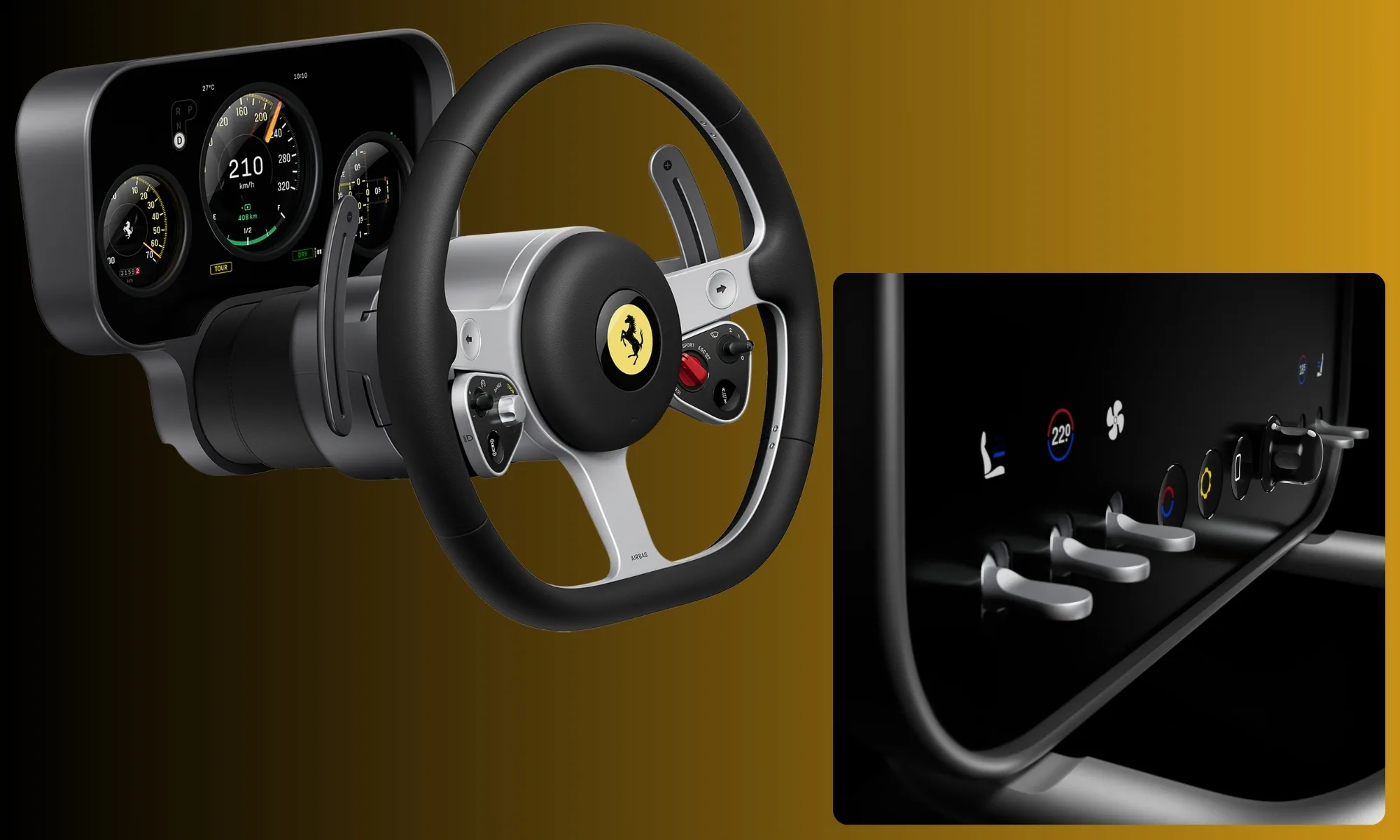 The Ferrari Luce is also the first car from the brand to feature an instrument cluster mounted on the steering column, and it features a one-of-a-kind dual OLED display with three cutouts. The control panel, notably, is mounted on a ball-and-socket joint, while the instrument cluster graphics draw inspiration from helicopters and airplanes.