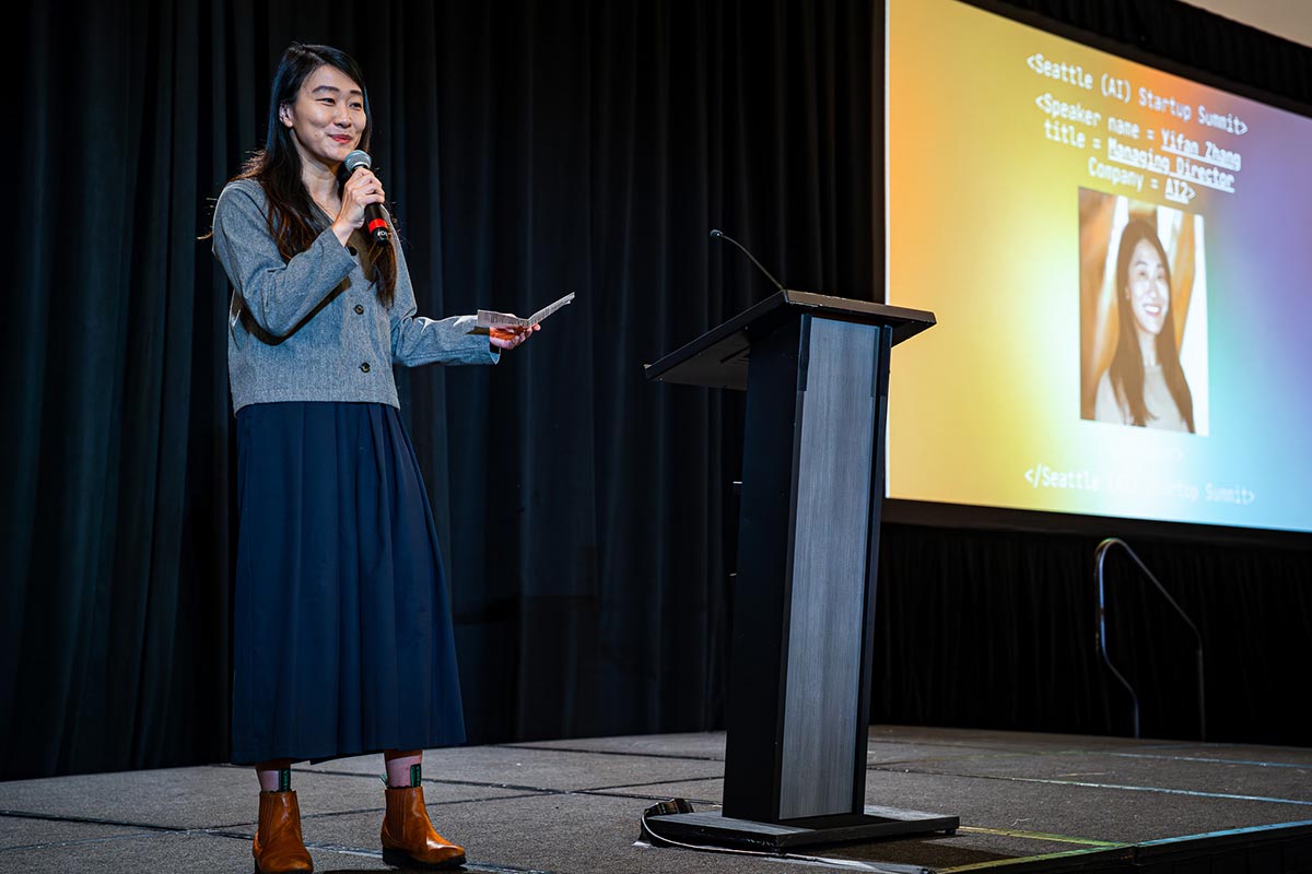 Yifan Zhang, AI2 Incubator co-managing director and AI House founder, speaks at the 2026 Seattle AI Startup Summit. (Ken Yeung Photo)
