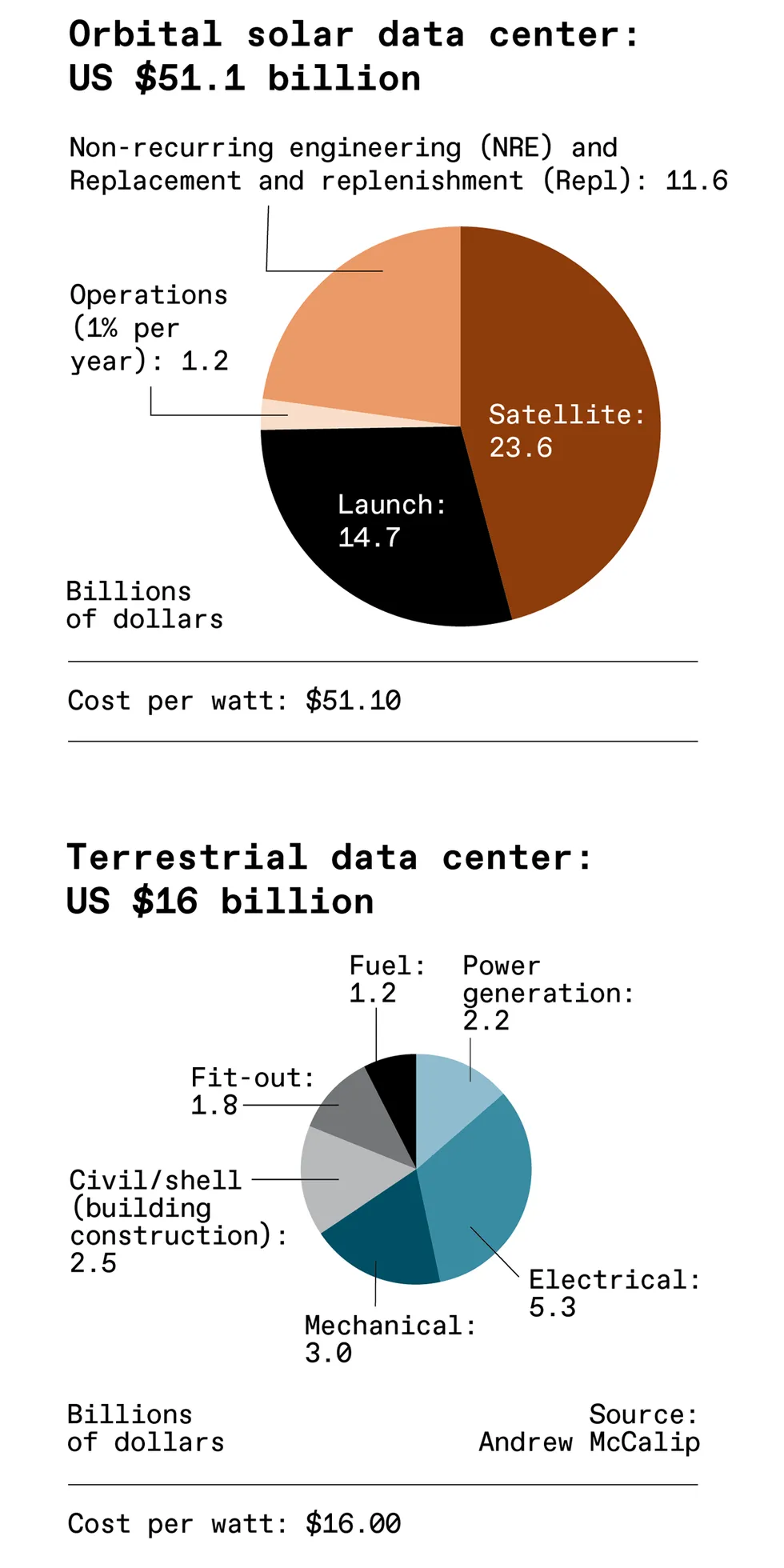 Pie charts compare the costs of orbital solar\u2014$51.1billion\u2014vs. terrestrial data center\u2014$16 billion. Likely costs to design, build, and launch a 1-GW orbital datacenter, based on a network of some 4,400 satellites and including operating costs over a five-year period, would exceed US $50 billion. That’s about three times the cost of a 1-GW data center on Earth, including five years of operation.John MacNeill