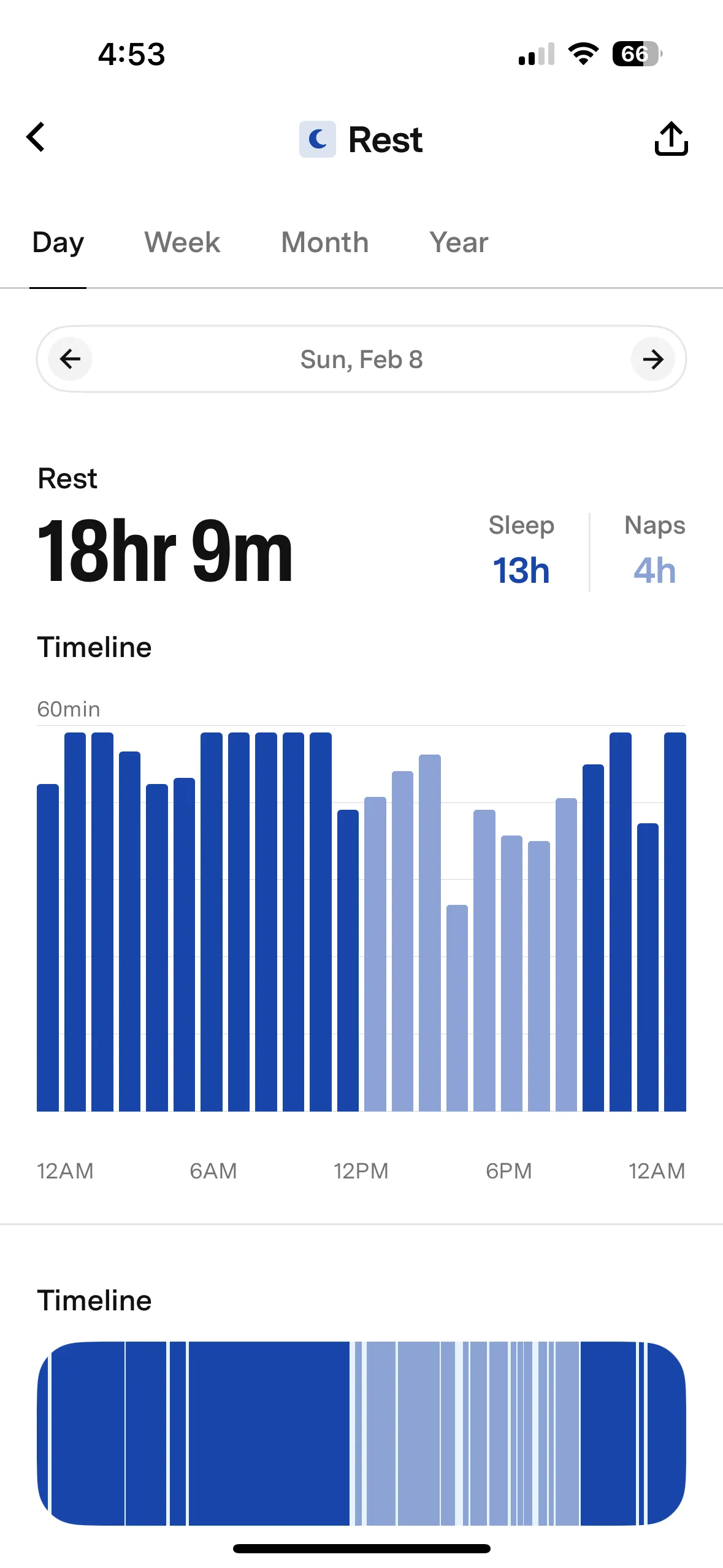 In the Rest tab, you can see sleep metrics, including a daily summary of deep sleep, naps, and interruptions during nightly sleep. You can compare this over time, and the app notes how much more or less Basil slept than the night before. It also compares stats historically, by week, month, and year, so you can track trends and better understand your pet’s normal sleep schedule.