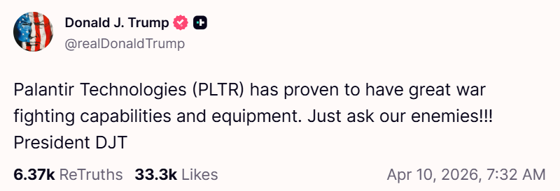 Earlier this month, Donald Trump posted on Truth Social that “Palantir Technologies (PLTR) has proven to have great war fighting capabilities and equipment. Just ask our enemies!!!” — notably including the stock ticker, because why not just make the market manipulation explicit.
