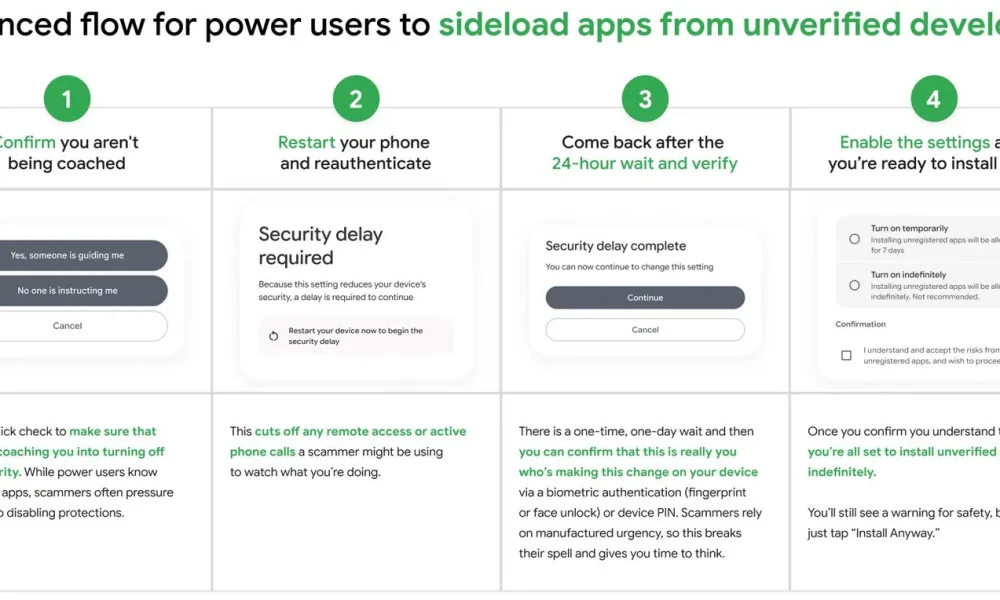 It’s no secret that Google really doesn’t like it that people are installing Android applications from any other source than the Play Store. Last year they proposed locking everyone into their official software repository by requiring all apps to be signed by verified developers, an identity which would be checked against a Google-maintained list. After a lot of pushback a so-called ‘advanced flow’ for installing even unsigned APKs would be implemented, and we now know how this process is supposed to work.
