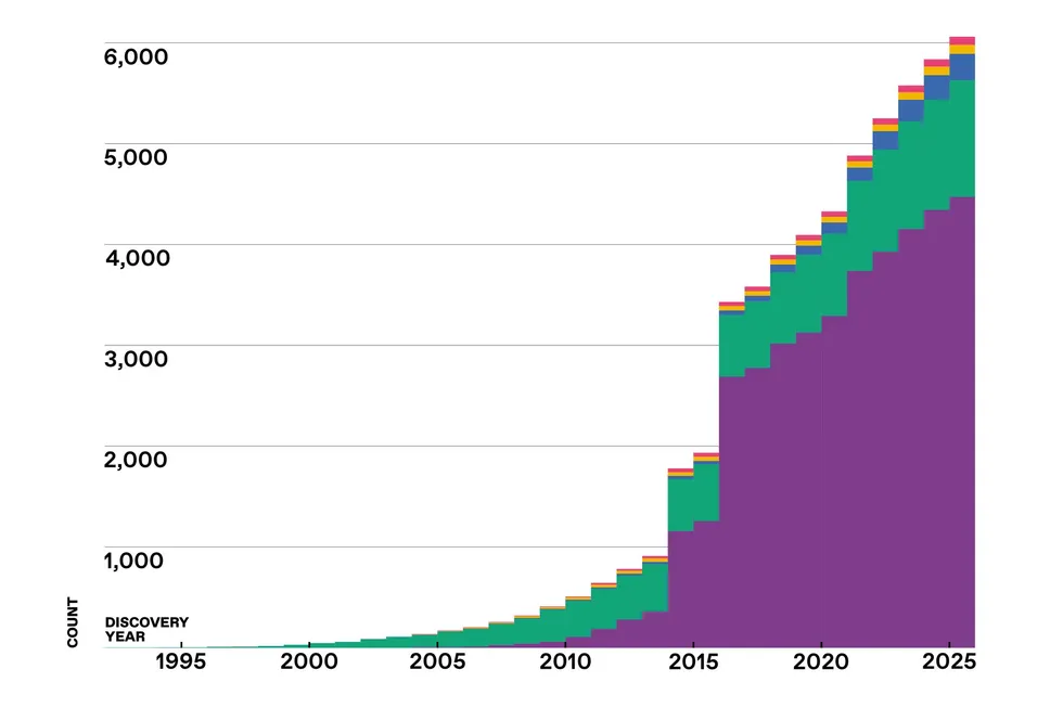 In the 1990s, astronomers confirmed the first planets orbiting stars beyond our sun. Since then, the tally has risen steadily, and last year it crossed a striking milestone: more than 6,000 known exoplanets. NASA’s Exoplanet Archive has captured not just the growing count but how dramatically the pace has accelerated, as new techniques and space telescopes have come on line. The steepest rises coincide with data releases from NASA’s Kepler space telescope, which discovered thousands of new planets.