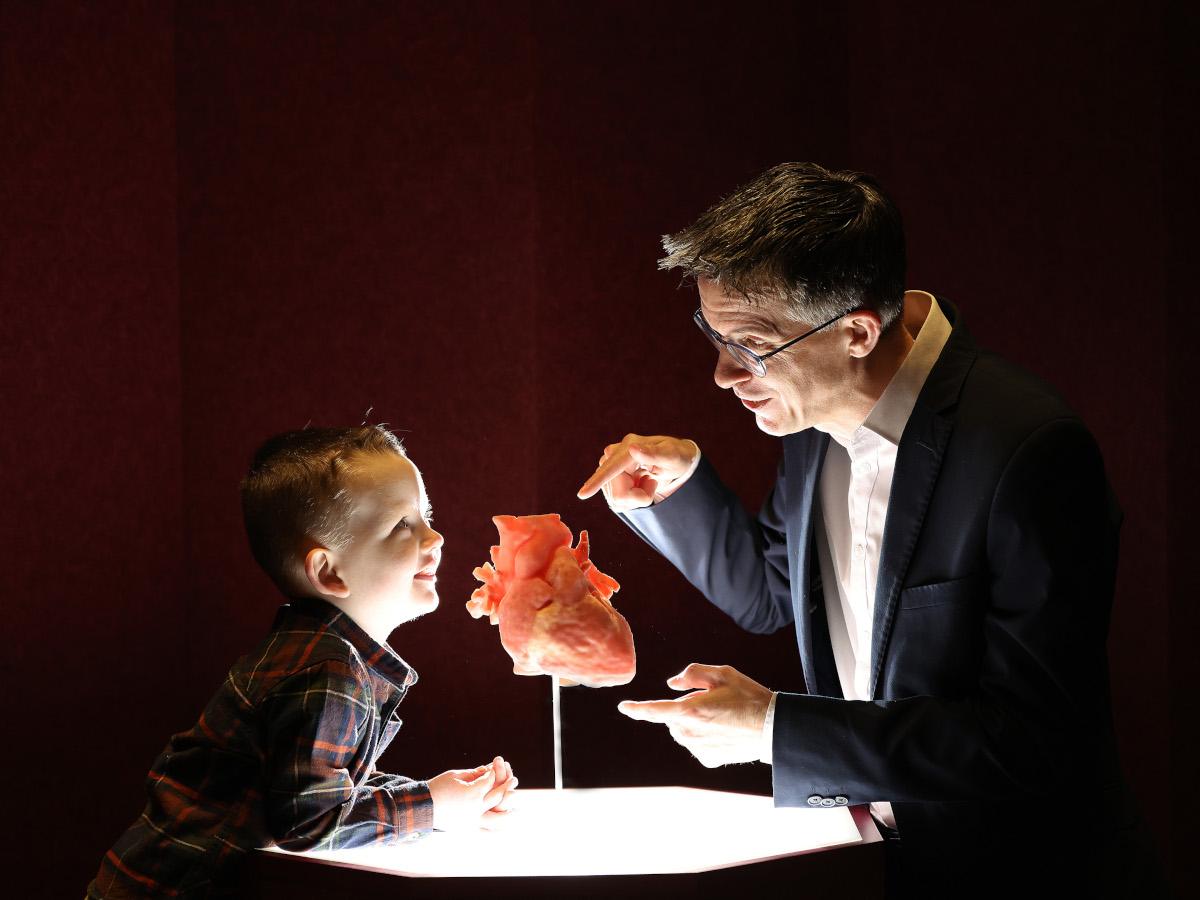Opening the exhibition today (10 February), the director of the Humanarium, Dr Alison Boyle said that the aim is to show “the science and stories behind every heartbeat”. She welcomed to the podium Ciarán Sloan, father of toddler James who underwent major heart surgery at just 10 months old. At the 20-week pregnancy scan, Sloan and his partner Cara McAreavey learned that James had serious heart abnormalities. Since then, the family have had a long journey of treatment and recovery.