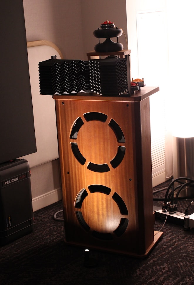 The pair at the show leaned toward the more refined end. They used ring-loaded ports in a lightly figured walnut baffle and ditched the coaxial tweeter altogether. In its place was a compression horn paired with a large 3D printed labyrinth lens, designed to improve dispersion and add a bit more realism compared to the original coaxial approach.