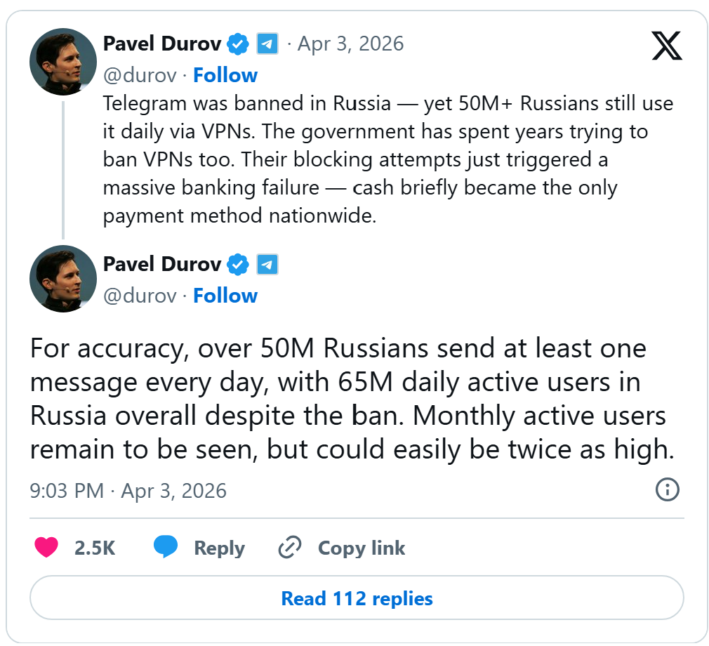 VPN use makes that harder. An estimated 50 million Russians still use VPNs to access Telegram, according to CEO Pavel Durov (happily posting away over at Elon Musk’s right wing propaganda website):